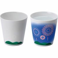 冷たい飲み物を入れると夏の情景が浮かびます。日に透けるほど薄くて軽い高級な磁器で、飲み口もスッキリとします。特殊な転写技術によって、17度以下に冷えると絵が浮き出ます。冷たい飲み物を入れて絵の変化をお楽しみください。
